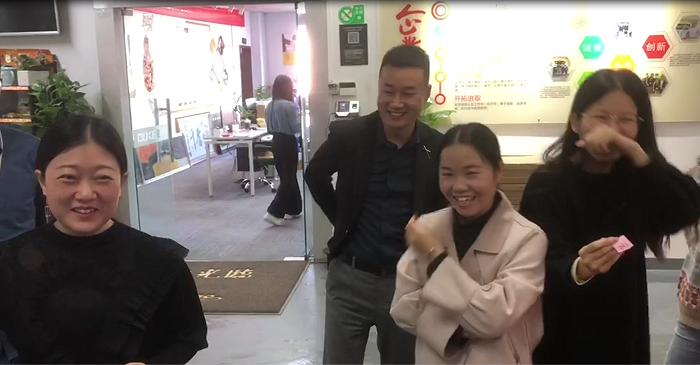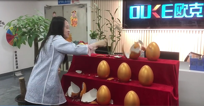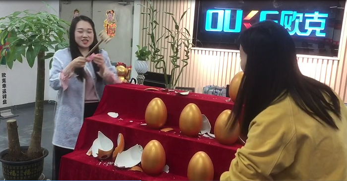 今天砸金蛋的第一位是公司的銷冠,因?yàn)殇N冠有事在武漢出差,有美麗大方的設(shè)計(jì)小姐姐代勞,設(shè)計(jì)小姐姐沒有讓我們的銷冠失望,一砸砸出來個(gè)500元現(xiàn)金大獎(jiǎng),這是一個(gè)大驚喜。